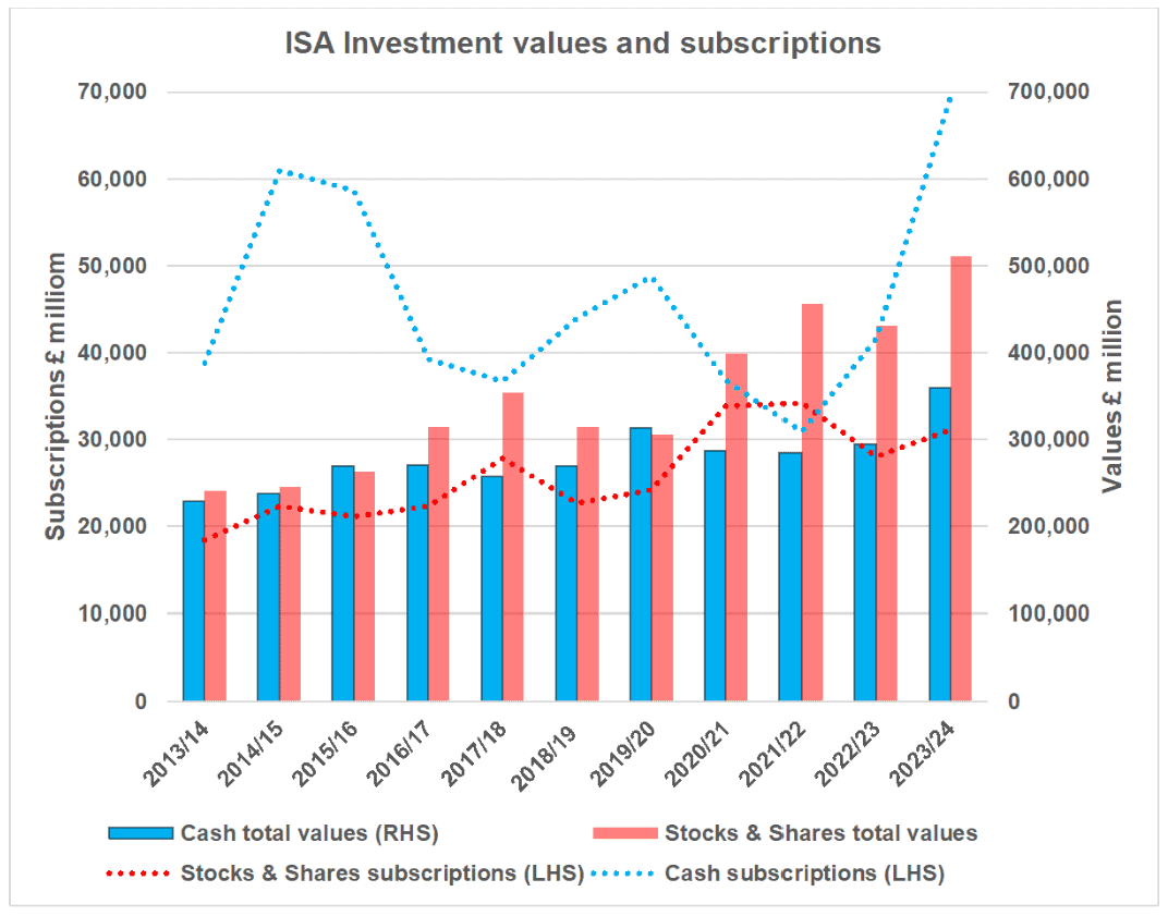 HMRC figures for 2023/24 show cash ISA subscriptions have increased by around 224% more than stocks and shares ISAs over the last 10 years.